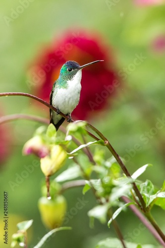 © Ji, Naklejka premium Western emerald sitting on branch, hummingbird from tropical forest,Colombia,bird perching,tiny beautiful bird resting on flower in garden,colorful background with flowers,nature scene,wildlife