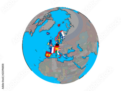© harvepino, Naklejka premium Western Europe with embedded national flags on blue political 3D globe. 3D illustration isolated on white background.