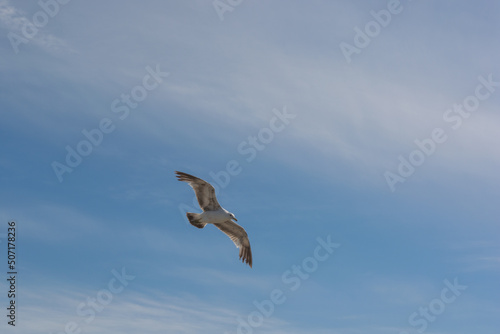 Obraz premium Western Gull Larus occidentalis bird flying gracefully overhead at Westport,...