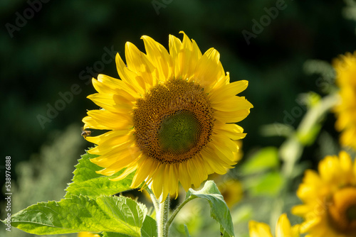 Fototapeta premium western honeybee flying towards a bright yellow sunflower with a blurred...