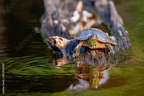 Fototapeta premium Western Painted Turtle (Chrysemys picta) crawling on a log in summer