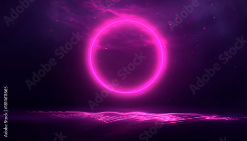 © MiaStendal, Fototapeta premium Wet asphalt, reflection of neon lights, a searchlight, smoke. Abstract light in a dark empty street with smoke, smog. Dark background scene of empty street, night view, night city.