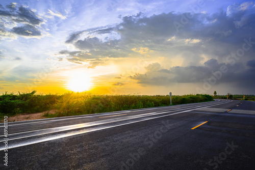 © patpitchaya, Fototapeta premium Wet asphalt road after rain in countryside at sunset, with a beautiful sky, and rain clouds