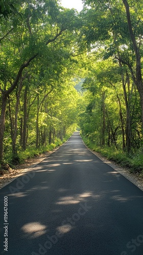Obraz premium Wet asphalt road leading through lush green forest after rain
