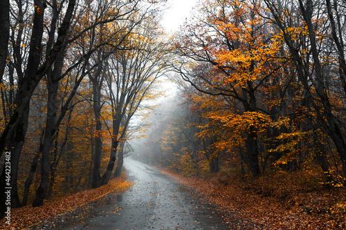 © Vastram, Obraz premium Wet asphalt road passing through colorful autumn forest