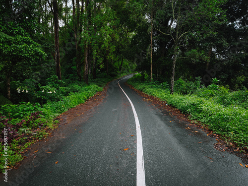 Fototapeta premium Wet asphalt road winding through lush green forest