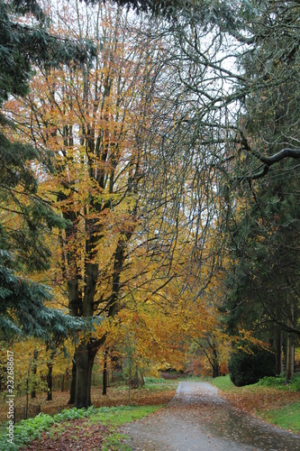 © Ewan, Fototapeta premium wet autumn road yellow trees