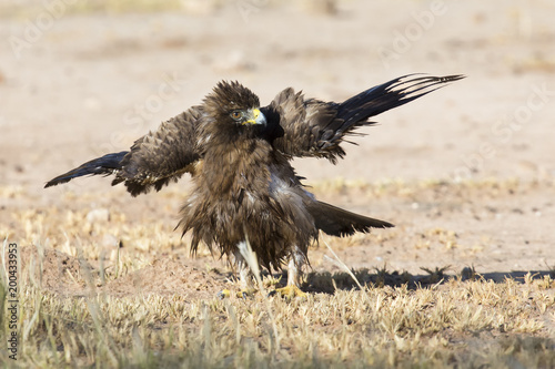 © Alta Oosthuizen, Obraz premium Wet Booted Eagle sit on the ground to dry out after a bath before take off again