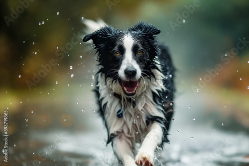 © Tymofii Borysenko, Fototapeta premium Wet border collie dog is running, water is dripping
