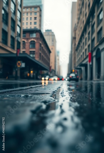 © KWY, Fototapeta premium wet city street with buildings and cars