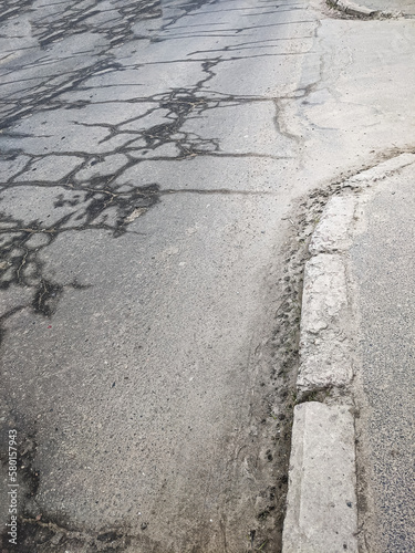 Obraz premium wet cracks on the asphalt surface of the road, a broken curb