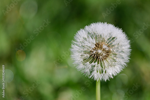 Fototapeta premium wet dandelion in the grass, soft green background with white flower,...