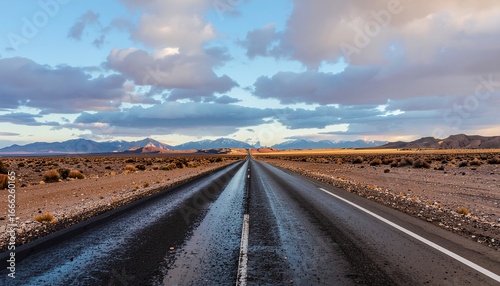 © Ulum, Naklejka premium Wet Desert Road Leading Towards Mountains Under Cloudy Sky.