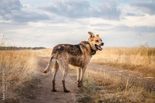 Obraz premium wet dog stands on the road in the field and is waiting for the owner