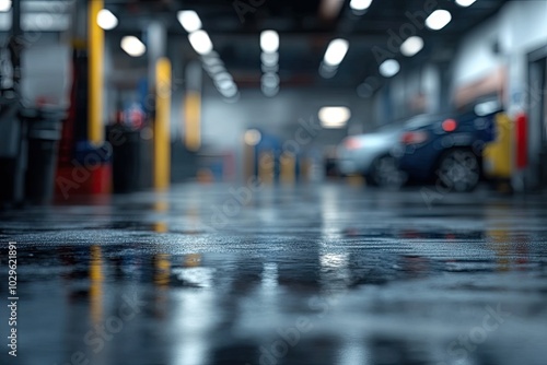 Fototapeta premium Wet floor with reflections, blurred background. This image can be used for various purposes, such as illustrating the concept of wet surfaces, car maintenance, or a rainy day.