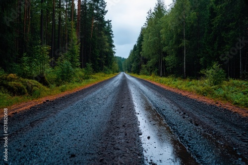 Naklejka premium Wet forest road journey, pine trees, overcast sky, travel