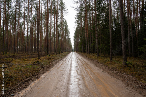© Rolands, Fototapeta premium wet forest road where many beautiful pines grow along the edges