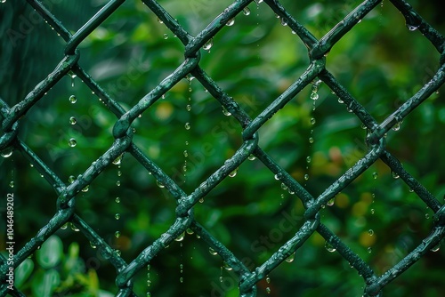 Fototapeta premium Wet green fence with drops in nature s background Close up of iron mesh