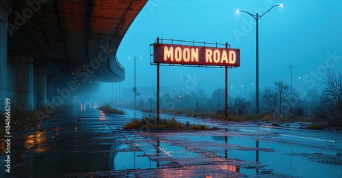 Obraz premium Wet highway underpass. Neon sign reads Moon Road. Gloomy atmosphere, blue tones, reflections visible. Sparse vegetation surrounds road.
