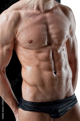 © IgorKireev, Fototapeta premium Wet muscular man torso on black white background