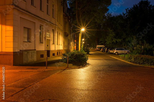 © 코끼리 잠자는, Fototapeta premium Wet night street with starburst lampposts and residential facades