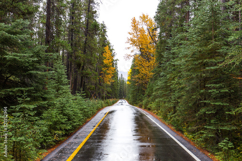 Naklejka premium Wet Road in Banff National Park going off into a distance through thick trees with fall colors