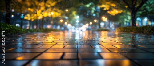 © Watcharaporn, Naklejka premium Wet sidewalk with reflections and a glossy surface after rain in an urban environment