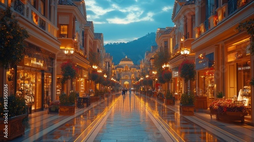 © diowcnx, Fototapeta premium Wet Street Nightscape: Illuminated Building Under Snowy Mountains