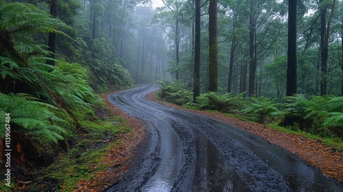 Obraz premium Wet, winding road cuts through lush, misty forest.