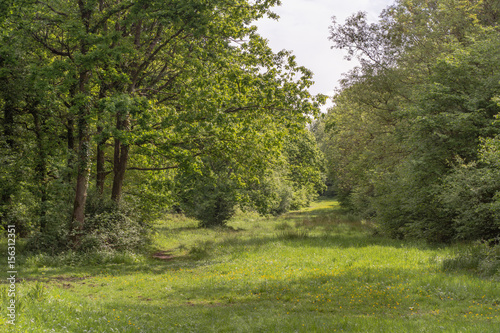 Fototapeta premium Wet woodland ride in Lower Woods nature reserve. Marshy grass path through...