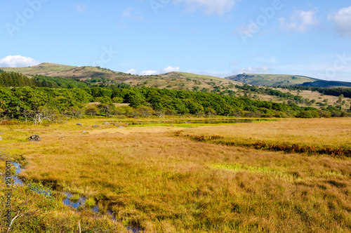 Fototapeta premium Wetlands of the plateau in Japan.Yellow grass.Sky reflected