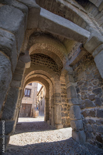 © Q, Fototapeta premium wewnątrz starożytnego budynku Brama Alfonsa VI, punkt orientacyjny i zabytek z X wieku, jeden z publicznych pieszych dojazdów do miasta Toledo, Hiszpania, Europa