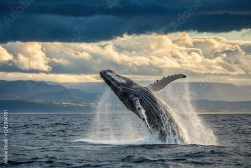 © AiGallery, Fototapeta premium Whale breaching in the ocean with a large spout, spray, wild animal, ocean creature