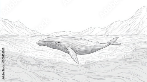 © Khaisan, Obraz premium Whale in the Arctic Sea with Mountain Backdrop Delicate Line Drawing