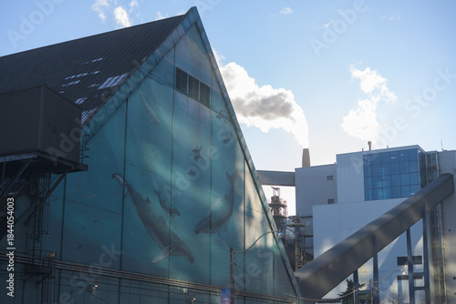 Naklejka premium whale mural on exterior of gable‑roofed industrial shed or A‑frame warehouse at Redpath Sugar Refinery located at 95 Queens Quay E, Toronto