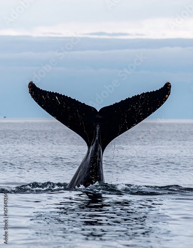 © Istirokah, Fototapeta premium Whale's fluke rises from ocean waves against a calm, hazy sky
