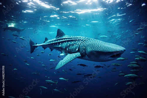Fototapeta premium Whale shark Rhincodon typus in the ocean, Whale shark and school of sharks in a deep blue ocean, AI Generated