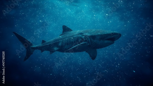 Fototapeta premium Whale Shark's Underwater Ballet: a majestic whale shark gracefully gliding through the deep, its massive form a testament to the mysteries of the ocean depths.