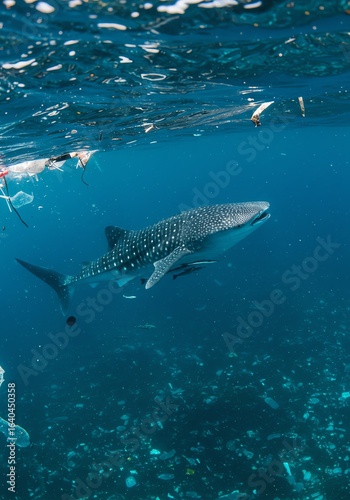 © singgih, Fototapeta premium Whale Shark Swimming in Ocean with Plastic Debris and Fish Underwater