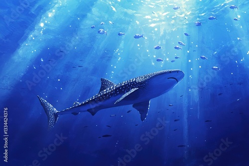© Rayhanios, Fototapeta premium Whale shark swimming underwater with sun rays shining through the ocean surface