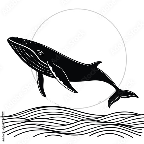 © Abu, Fototapeta premium Whale swimming above glowing horizon silhouette