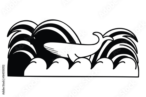 © Monivara Creations, Naklejka premium Whale swimming in the ocean waves, black and white vector illustration