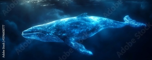 Fototapeta premium Whale swims underwater, ethereal and blue, in the deep ocean, background light shines
