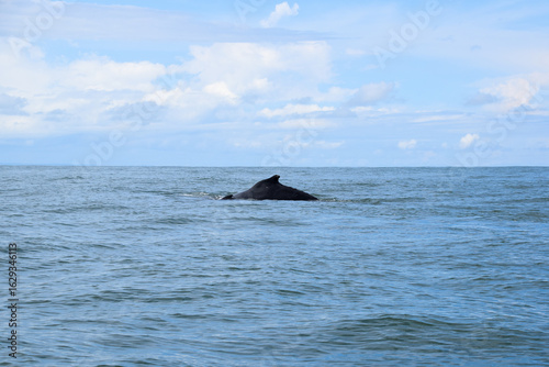 © Marissa, Obraz premium Whale tail emerging from ocean with mountain backdrop