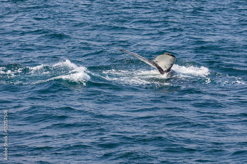 Fototapeta premium Whale watching. Humpback whale tail with selected focus. Husavik, Iceland.