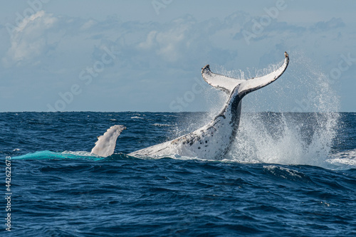 © John, Fototapeta premium Whale watching humpback whales up close near Byron Bay, NSW on the east coast of Australia. Whales tail lobbing.
