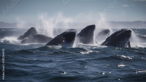 © KWY, Fototapeta premium Whales jumping into the water generative ai