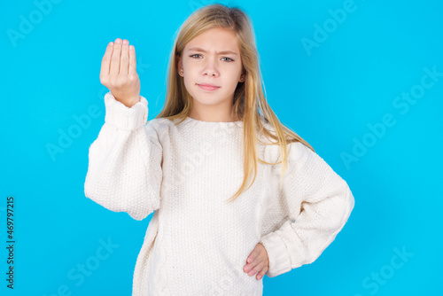 © Jihan, Fototapeta premium What the hell are you talking about. Shot of frustrated caucasian little kid girl wearing wool jersey over blue background gesturing with raised hand doing Italian gesture, frowning
