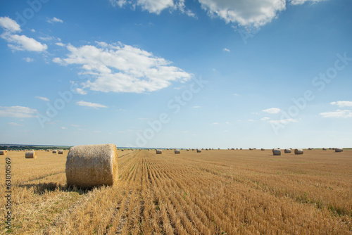 Fototapeta premium Wheat bales in a clean field after harvest. Rural landscape. Ukraine.