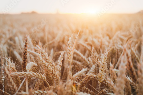 © Song_about_summer, Fototapeta premium wheat crop field beautiful background with golden sunset light, harvesting cereals
